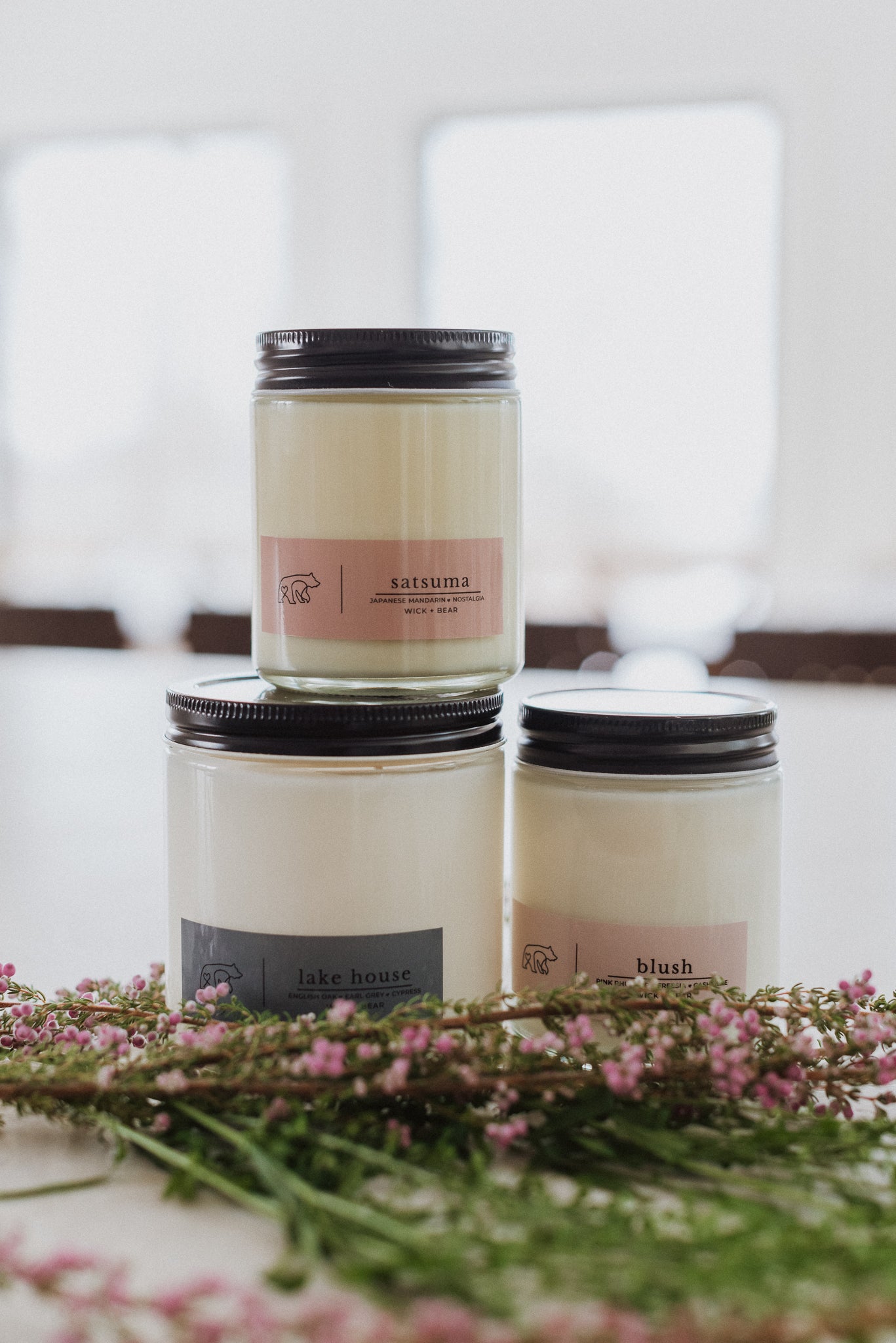 Each candle is made with cotton wicks and natural soy wax. The low melting point of the soy wax allows for longer burn time.