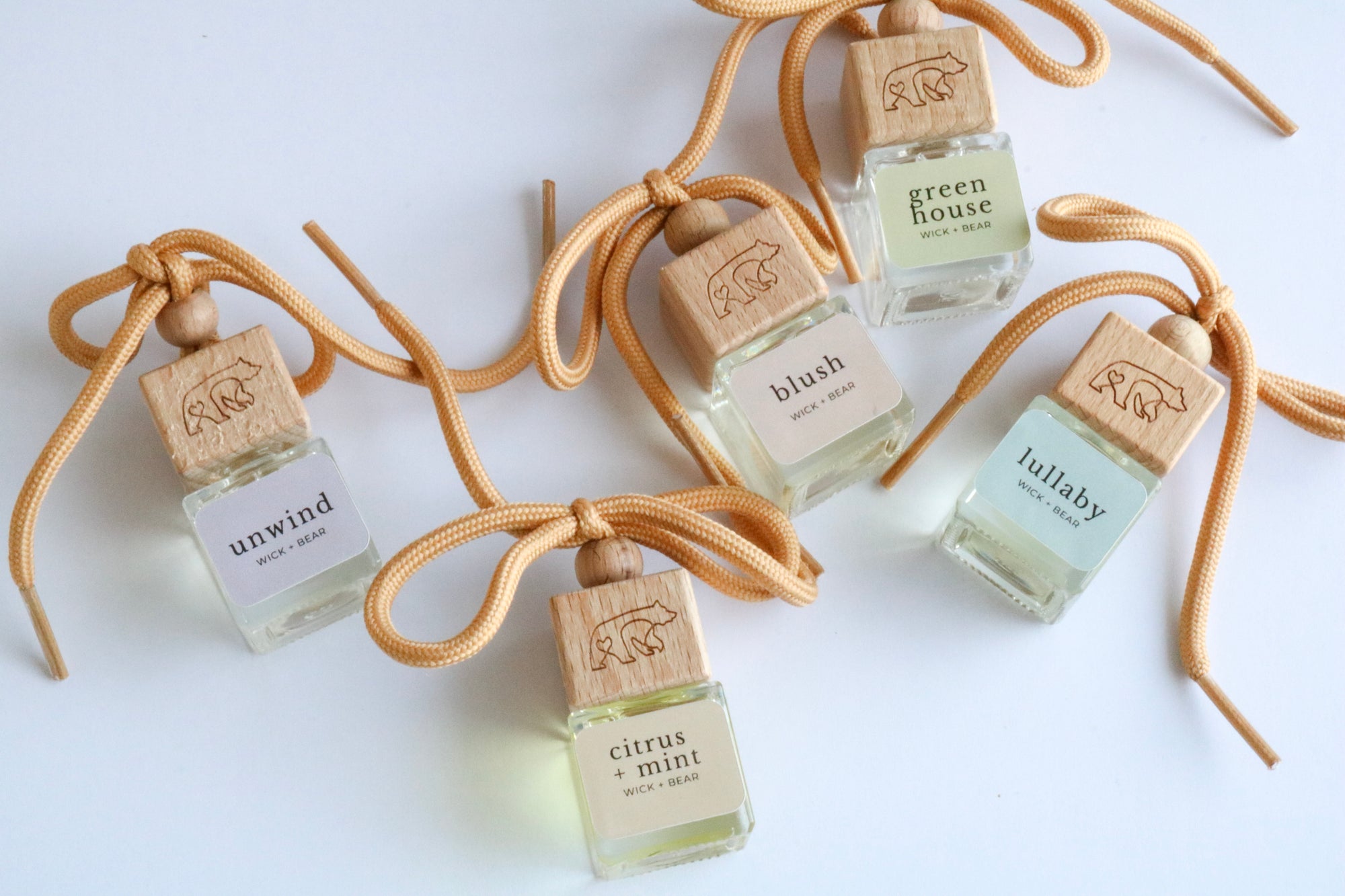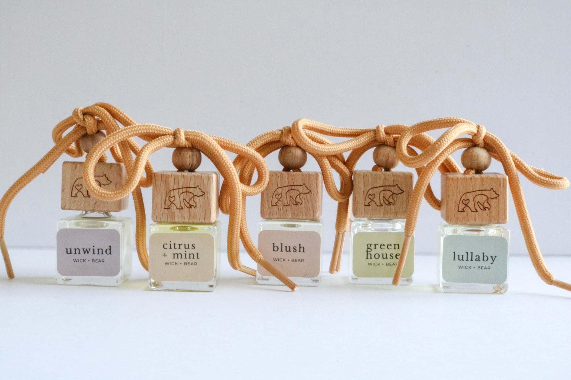 Our car diffusers come equipped with a glass bottle, a wooden cap, plastic topper, rope, and your favourite scented oil.