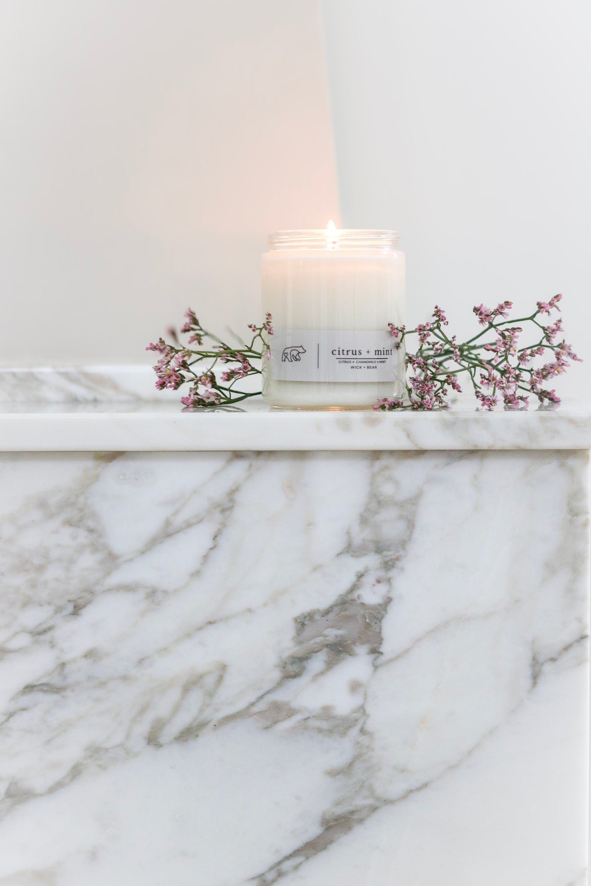 Each candle is made with cotton wicks and natural soy wax. The low melting point of the soy wax allows for longer burn time.
